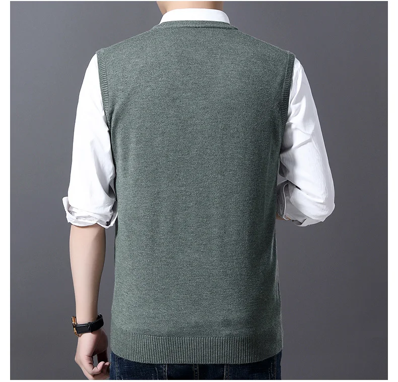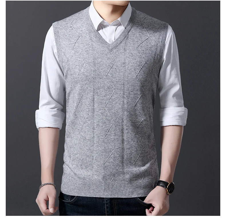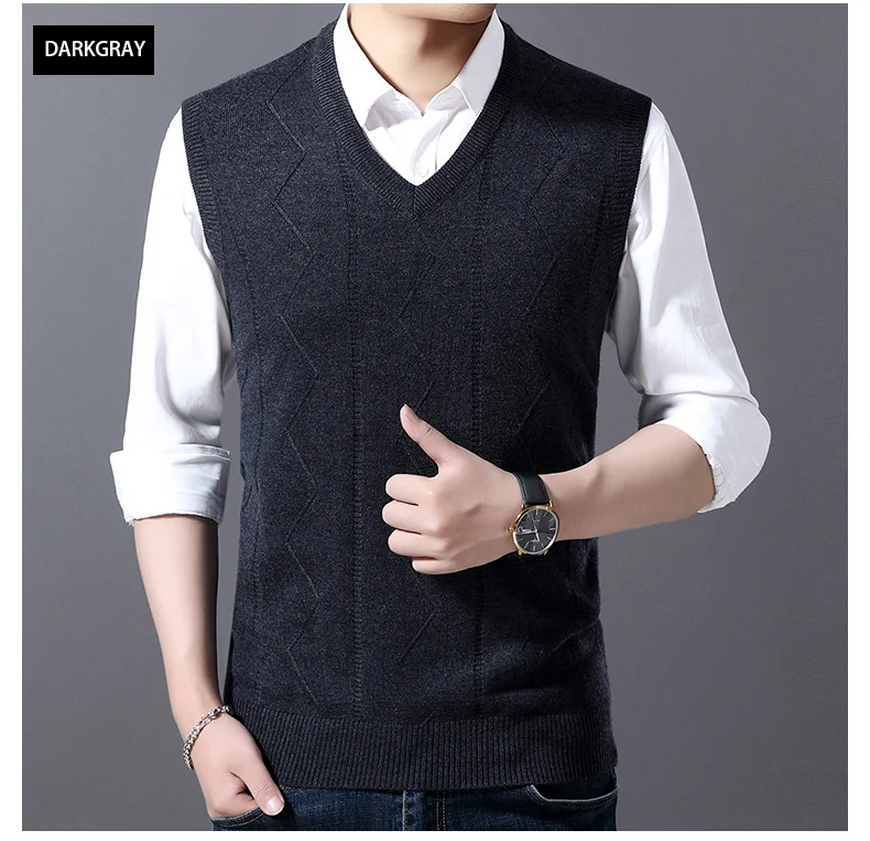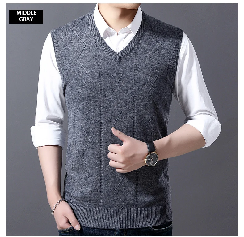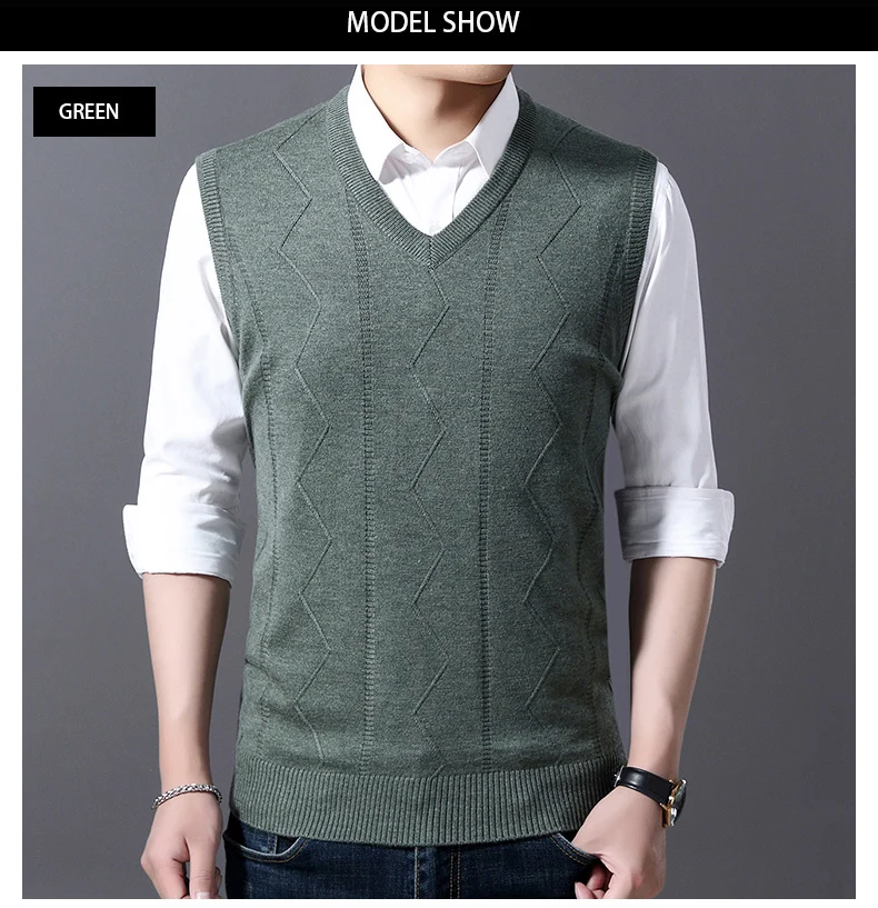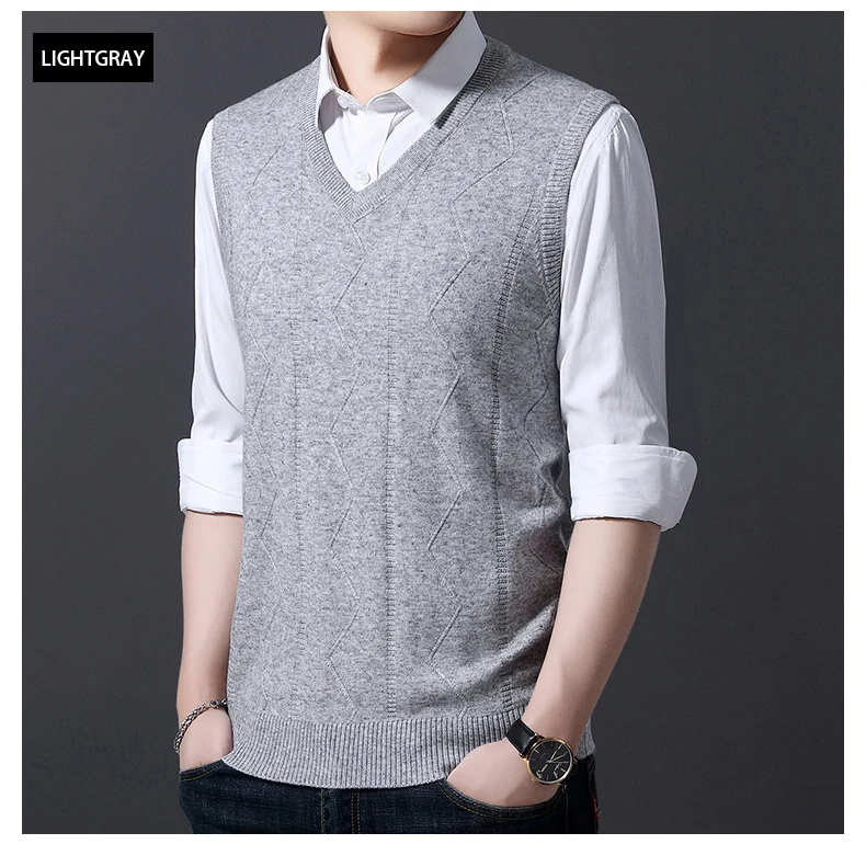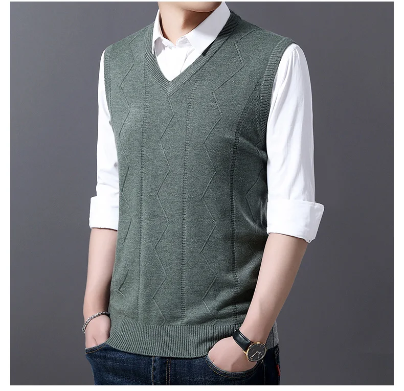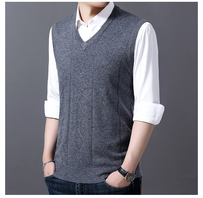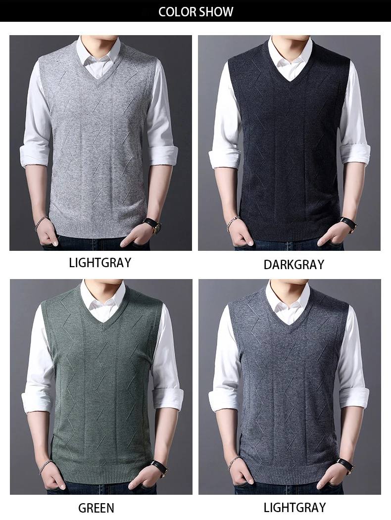 This V-neck knitted vest is a timeless addition to any wardrobe, offering both warmth and sophistication. Its sleeveless design ensures comfort and versatility, while the solid color finish makes it easy to style for both casual and refined looks. A must-have for men who value effortless style during the colder months.