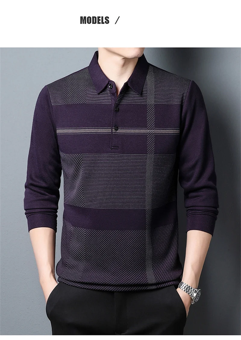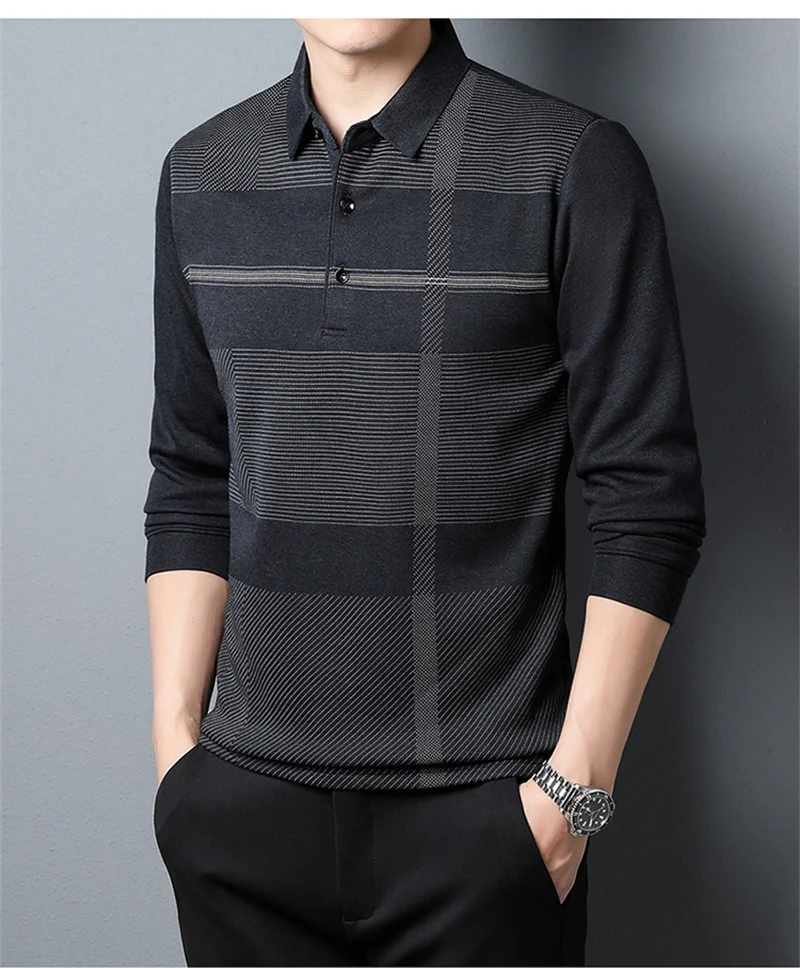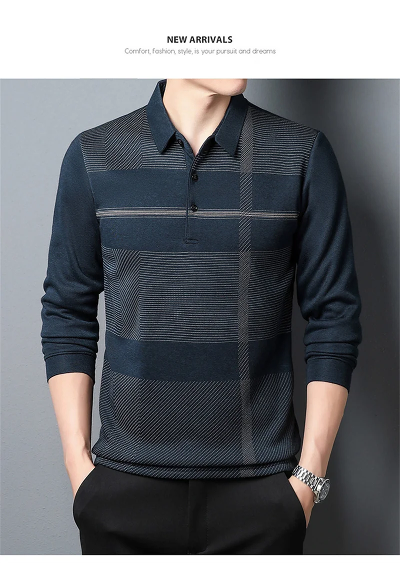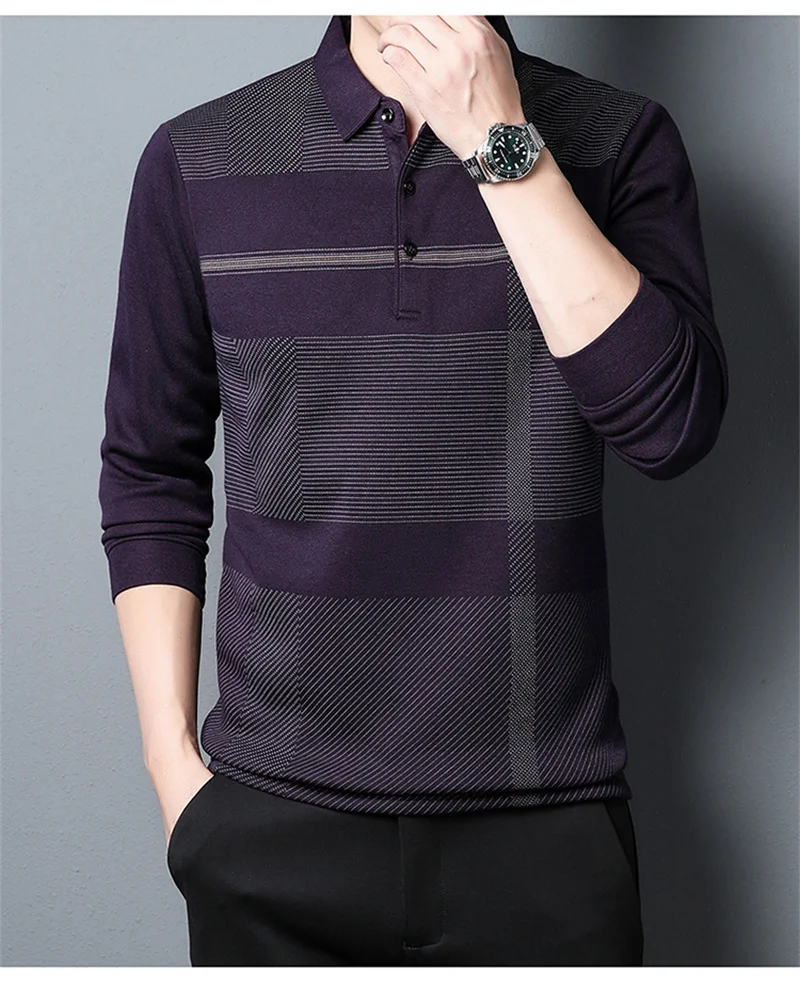 Men’s Long Sleeve Casual Tee – Turn-Down Collar Striped Print Slim Fit Shir